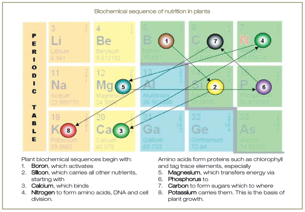 In the realm of plant nutrition, a conceptual model known as the Biochemical Sequence of Nutrition outlines a simplified pathway for nutrient uptake and utilization, starting with boron as the initial activator that enhances sap pressure and facilitates the mobilization of other elements.
